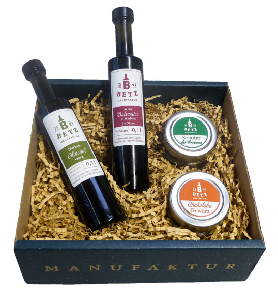 Mediterraner Genuss in seiner klaren, authentischen Form: Dieses Präsentset kombiniert erstklassiges Olivenöl nativ extra aus der italienischen Region Latium mit einem fein gereiften Aceto Balsamico di Modena und zwei klassischen Kräutermischungen, die jede Küche veredeln. Ein hochwertiges Geschenk für Genießer - geschmackvoll, vielseitig und mit südlichem Flair.