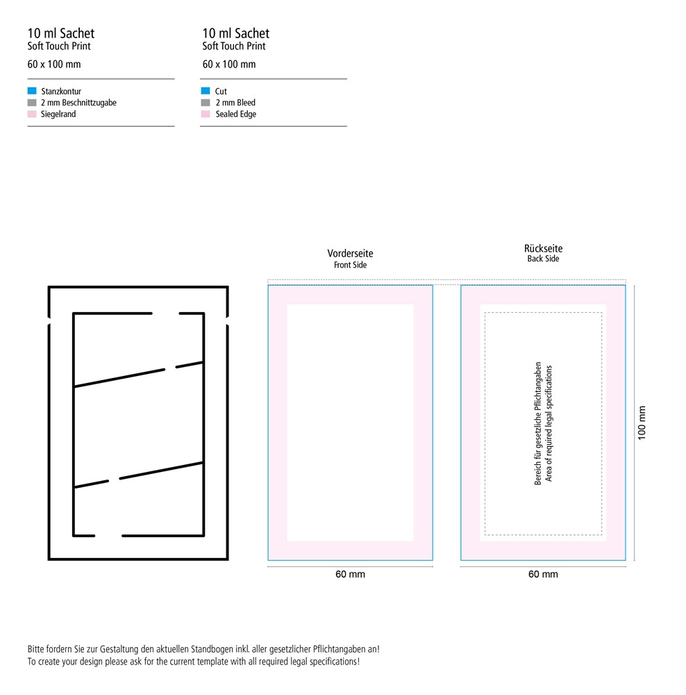 Druck auf das Sachet: 4c (CMYK) mit matter Soft-Touch-Oberfläche