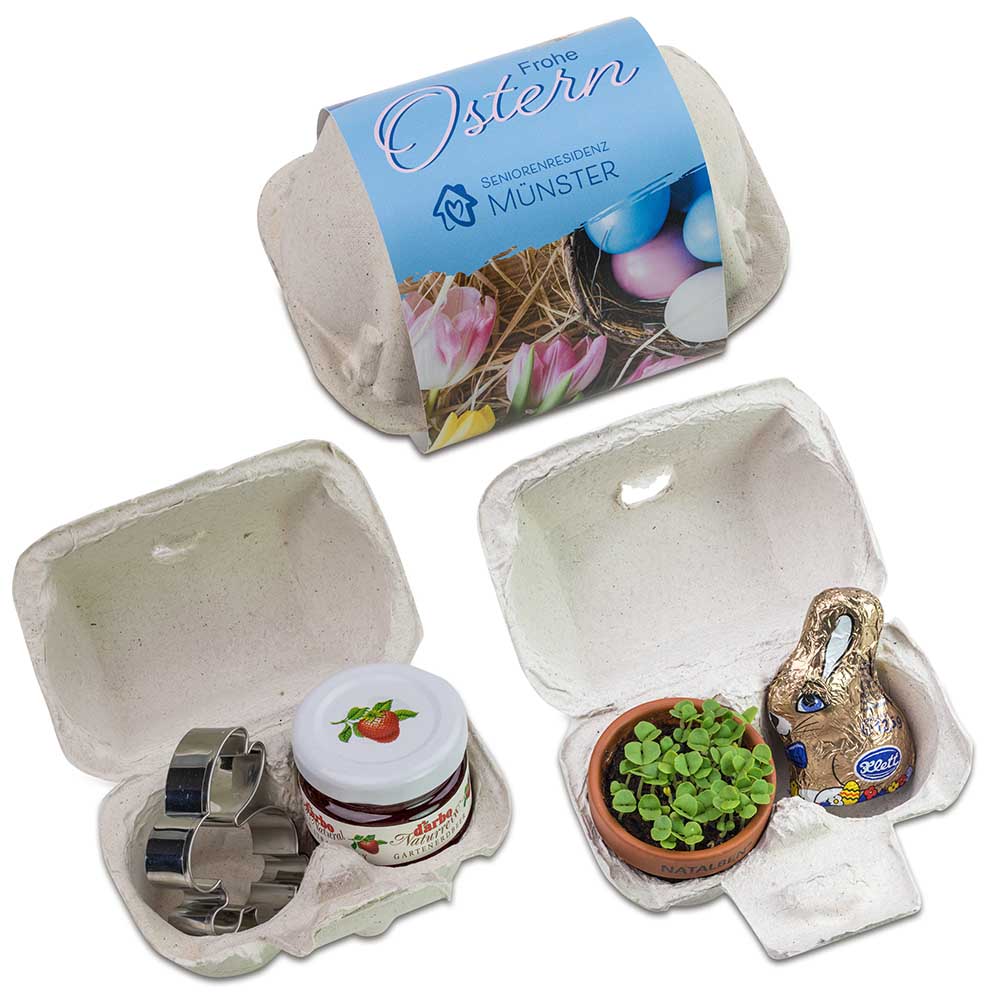 Ei mal 2! Das Erfolgsprodukt „Das Gelbe vom Ei“ ist auch im kleineren 2er-Set erhältlich und wird so zu einem ganz speziellen Osternestchen. In einem echten Eierkarton werden entweder ein Tontöpfchen mit Substrattablette und Eierbaumsamen und ein Schoko-Hase oder ein Backförmchen in Hasenform und eine leckere Marmelade geliefert. Die persönliche Werbebotschaft passt perfekt auf die umlaufende Papierbanderole, die dem Osterpräsent Ihre ganz individuelle Optik verpasst.