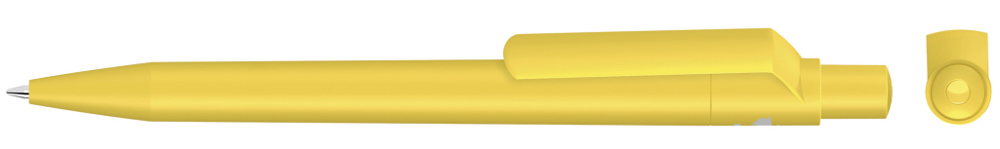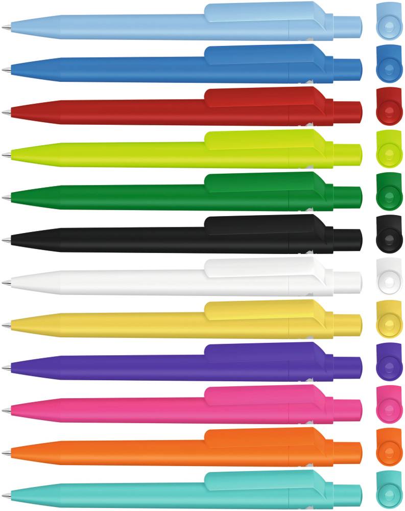 Druckkugelschreiber mit gedeckt mattem Gehäuse, Clip, Drücker und Stopfen aus recyceltem ABS-Kunststoff.