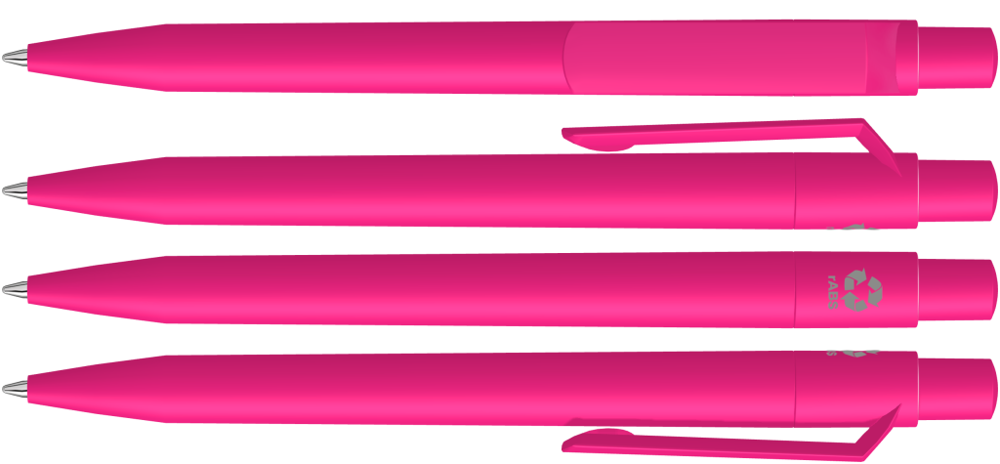 Druckkugelschreiber mit gedeckt mattem Gehäuse, Clip, Drücker und Stopfen aus recyceltem ABS-Kunststoff.