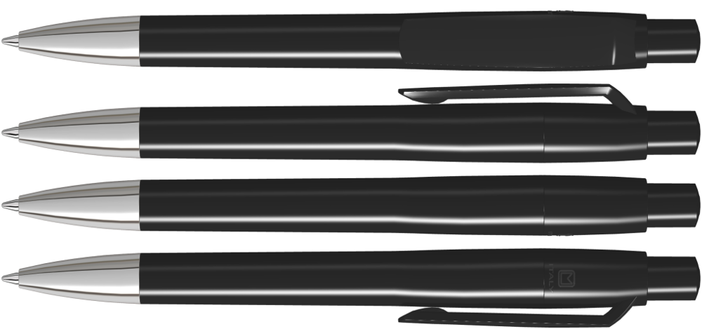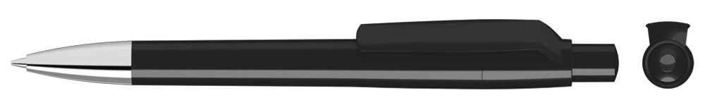 Druckkugelschreiber mit gedeckt glänzendem Gehäuse, Clip, Drücker und Stopfen. Spitze glanzverchromt.