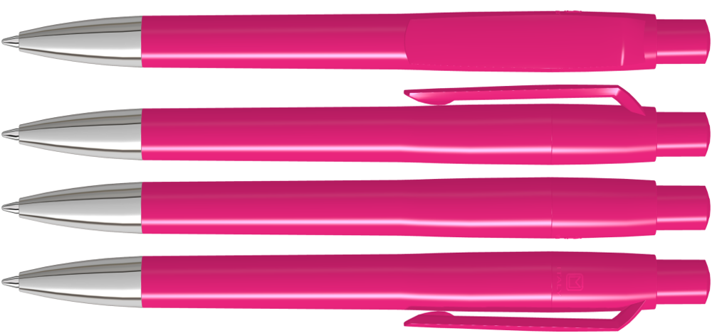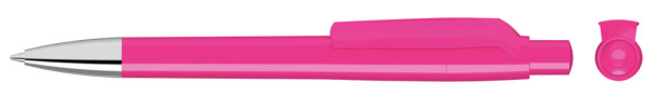 Druckkugelschreiber mit gedeckt glänzendem Gehäuse, Clip, Drücker und Stopfen. Spitze glanzverchromt.