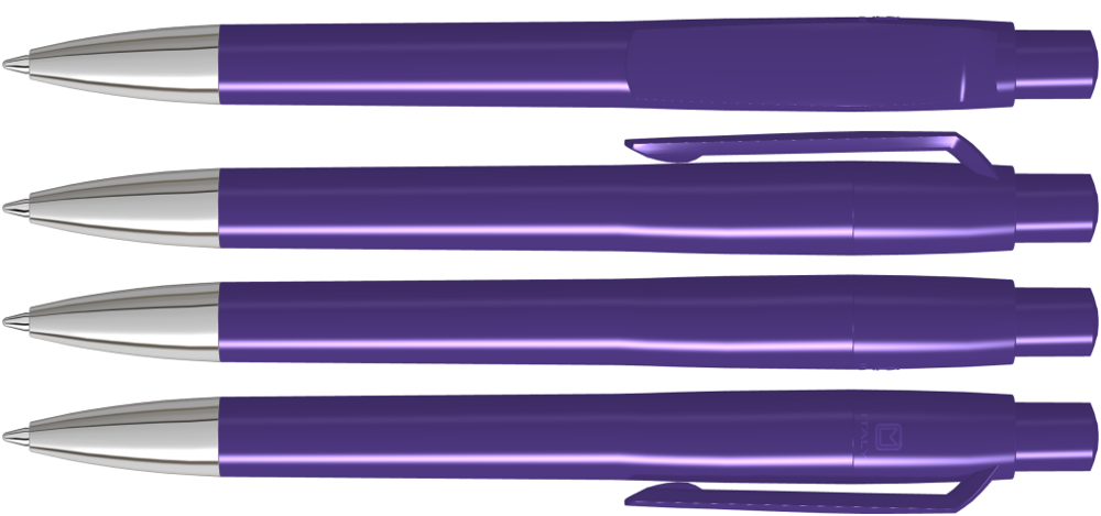 Druckkugelschreiber mit gedeckt glänzendem Gehäuse, Clip, Drücker und Stopfen. Spitze glanzverchromt.