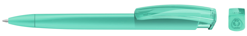 Druckkugelschreiber mit gedeckt mattem Dreikantgehäuse und transparent glänzendem Clip aus recyceltem ABS Kunststoff. Das Modell ist mit dem Recyclingzeichen gekennzeichnet.