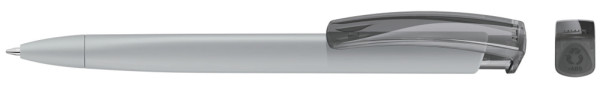 Druckkugelschreiber mit gedeckt mattem Dreikantgehäuse und transparent glänzendem Clip aus recyceltem ABS Kunststoff. Das Modell ist mit dem Recyclingzeichen gekennzeichnet.