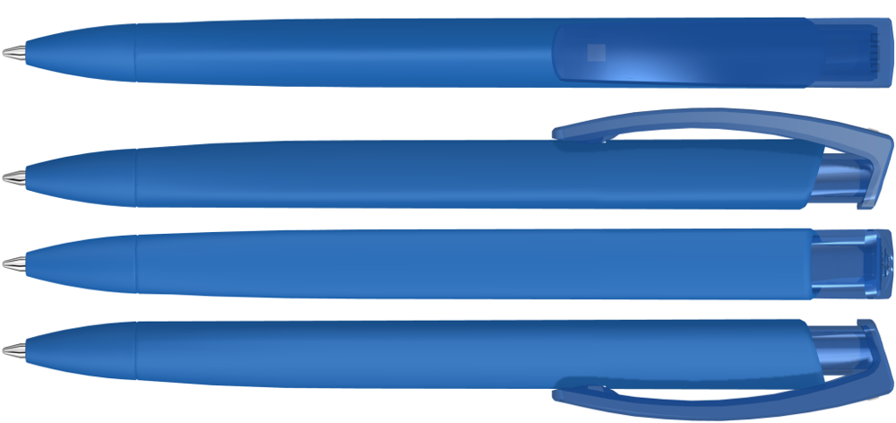 Druckkugelschreiber mit gedeckt mattem Dreikantgehäuse und transparent glänzendem Clip aus recyceltem ABS Kunststoff. Das Modell ist mit dem Recyclingzeichen gekennzeichnet.