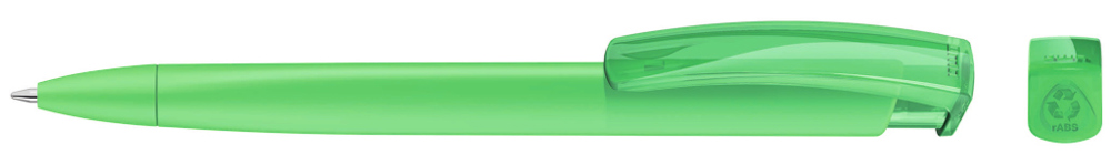 Druckkugelschreiber mit gedeckt mattem Dreikantgehäuse und transparent glänzendem Clip aus recyceltem ABS Kunststoff. Das Modell ist mit dem Recyclingzeichen gekennzeichnet.