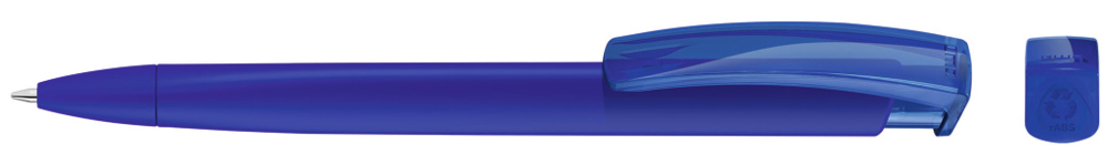 Druckkugelschreiber mit gedeckt mattem Dreikantgehäuse und transparent glänzendem Clip aus recyceltem ABS Kunststoff. Das Modell ist mit dem Recyclingzeichen gekennzeichnet.