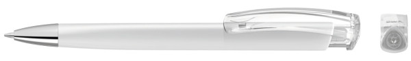 Druckkugelschreiber mit gedeckt mattem Dreikantgehäuse, transparent glänzendem Clip aus recyceltem ABS Kunststoff und schwerer Metallspitze glanzverchromt. Das Modell ist mit dem Recyclingzeichen gekennzeichnet.