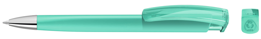 Druckkugelschreiber mit gedeckt mattem Dreikantgehäuse, transparent glänzendem Clip aus recyceltem ABS Kunststoff und schwerer Metallspitze glanzverchromt. Das Modell ist mit dem Recyclingzeichen gekennzeichnet.