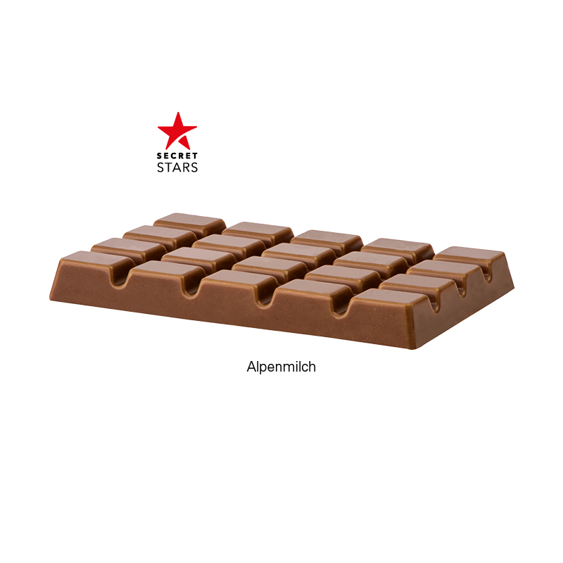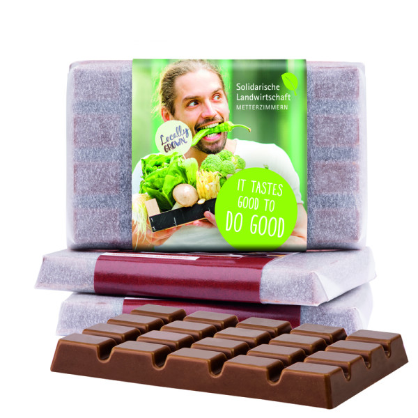 Design Schokolade im Pergaminpapier mit weißer Papierbanderole, individuell bedruckt. Inhalt: 1 Täfelchen Alpenvollmilchschokolade, eingewickelt in Pergaminpapier (kann über die Papiertonne entsorgt werden), 10 g
