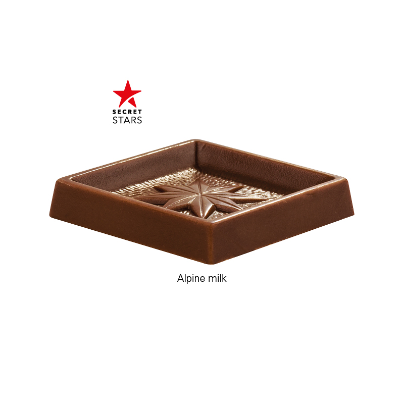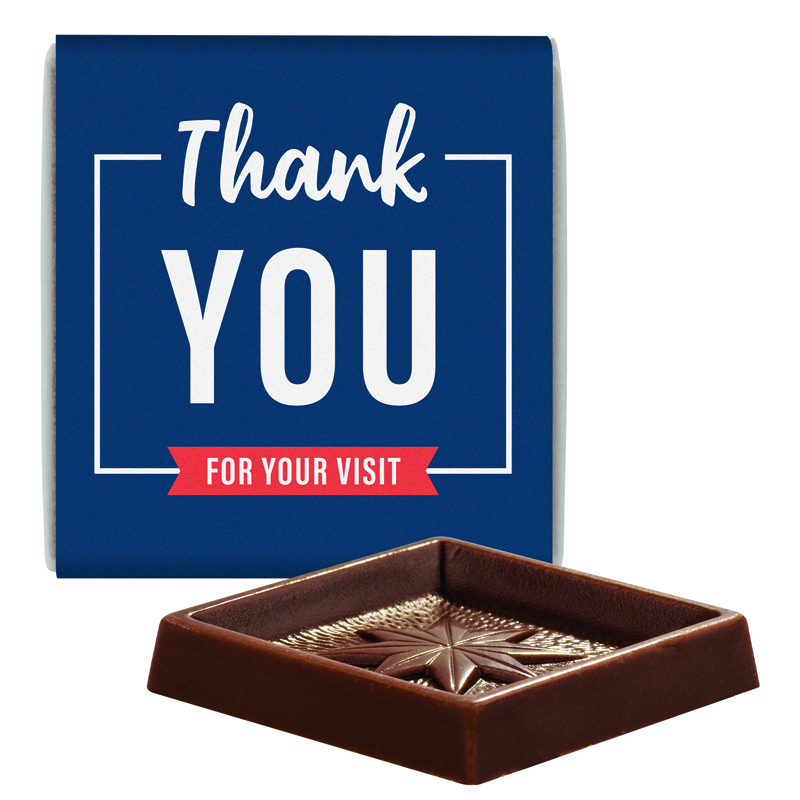 Quadrat Täfelchen in Pergaminpapier mit Papierbanderole, individuell bedruckt. Inhalt: 1 Täfelchen Alpenvollmilchschokolade in feinster Qualität, eingewickelt in Pergaminpapier (kann über die Papiertonne entsorgt werden), 5 g