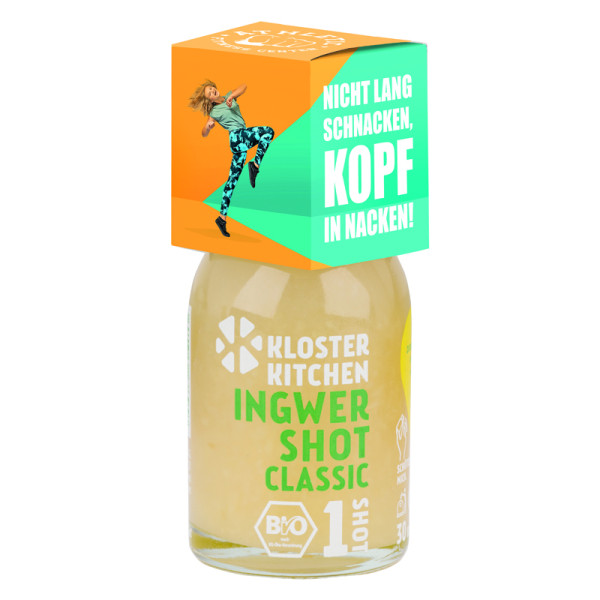 Klosterkitchen BIO Ingwer Shot mit Werbeaufsetzer aus weißem Karton, individuell bedruckt. Inhalt: 1 Klosterkitchen BIO Ingwer Shot mit Ingwerstückchen, 30 ml. Keine Kühlung bis zur Öffnung nötig, 30 g
