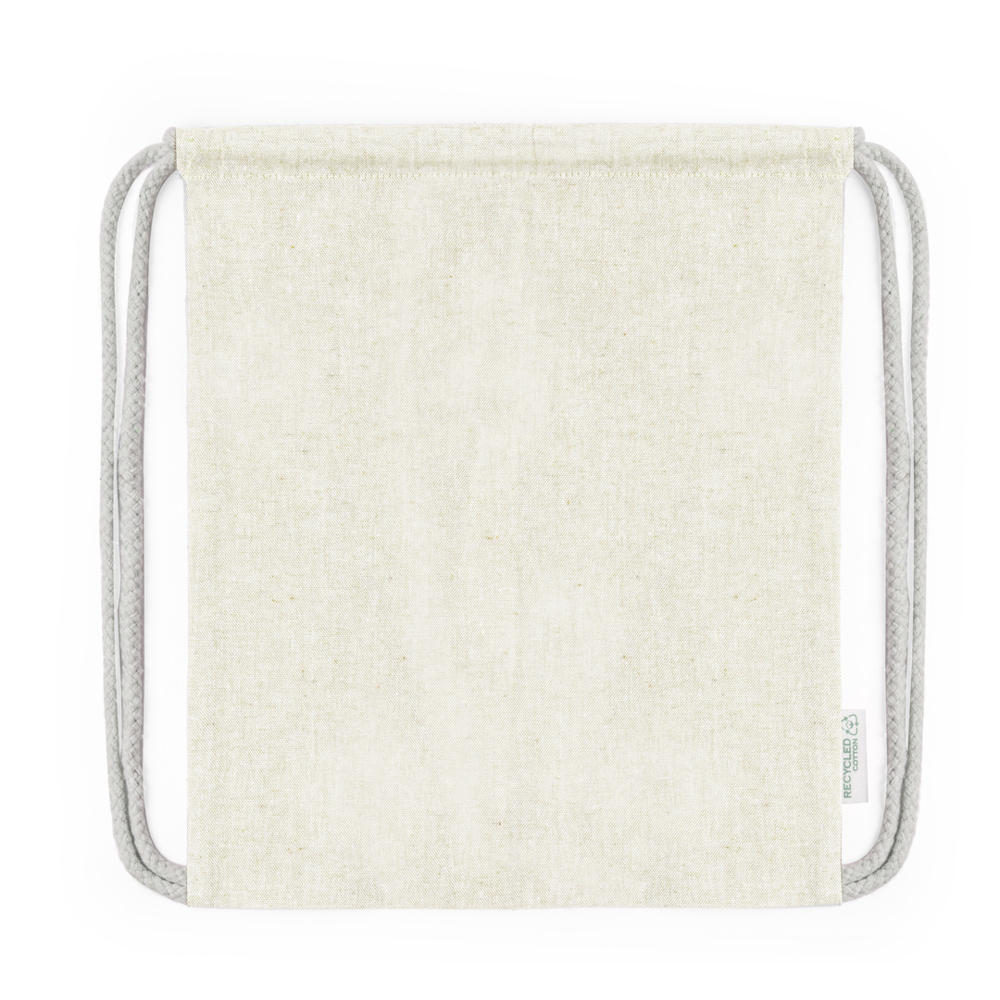 Rucksack mit Kordelzug aus recycelter Baumwolle 120 g/m2. Selbst schließende Schnüre aus Baumwolle, mit Öko-Label auf einer Seite und in einer breiten Palette von Naturfarben erhältlich. Belastbar bis zu 4kg Gewicht.