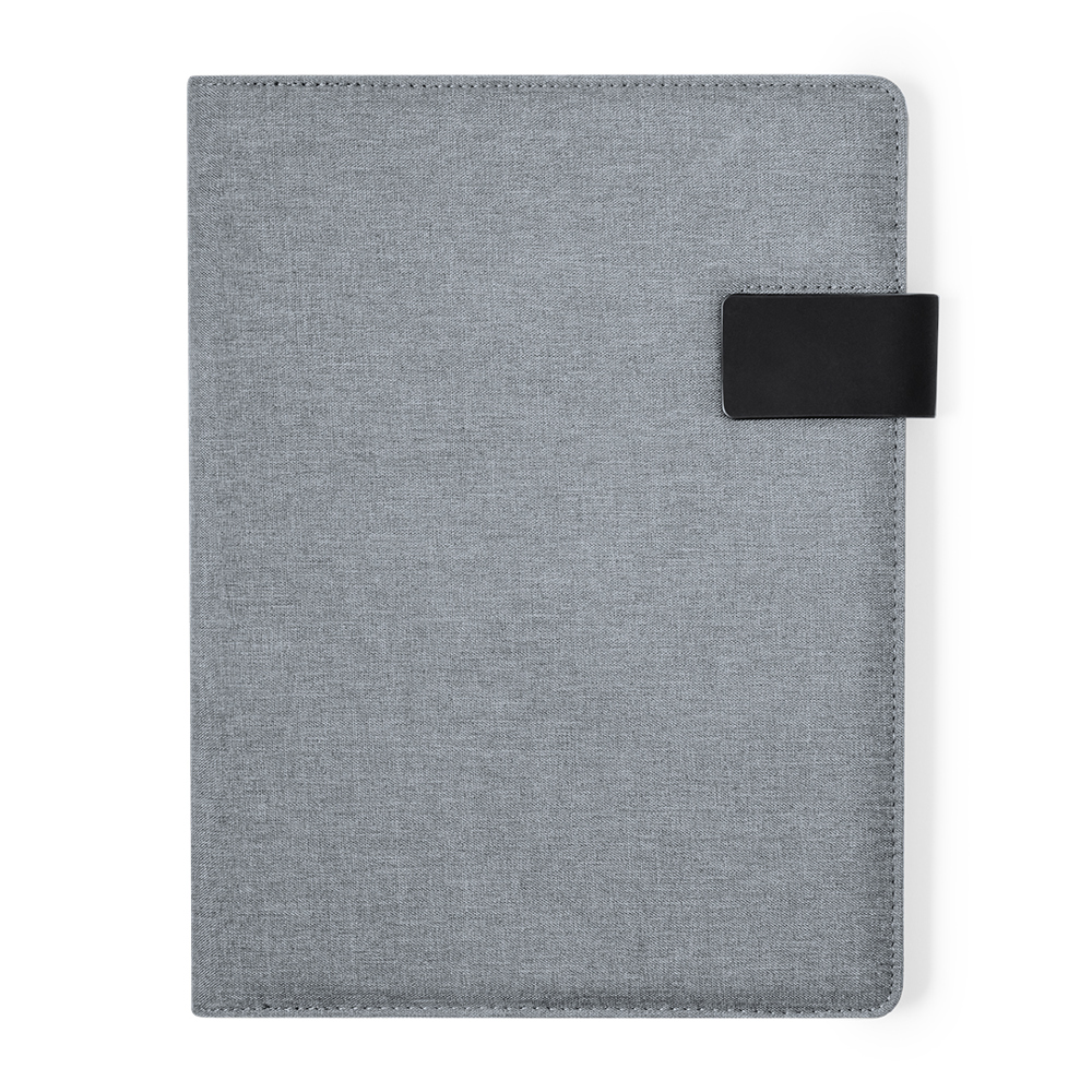 Praktischer Ordner aus RPET 600D. Mit einem effizienten Innendesign, das Fächer für 4 Karten, 3 elastische Taschen für mobile Geräte und viel Platz für Papierblätter umfasst. Dieser Organizer verfügt außerdem über einen praktischen Stifthalter und einen Notizblock mit 20 Seiten im Einzelstreifen-Design. Dank der magnetischen Klappe lässt es sich sicher verschlossen halten. Erhältlich in stilvollen Farben und einzeln in einer recycelten Tasche präsentiert.