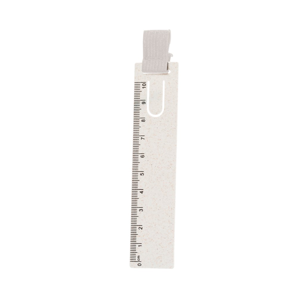 Originelles Lesezeichenlineal aus Weizenstroh. Praktisches Messgerät bis 10 cm mit Lasche als Lesezeichen und elastischem Band zum Halten von Stiften. Aus Weizenstroh und Polyester.