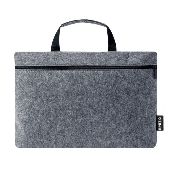 Dokumententasche aus strapazierfähigem RPET-Filz mit Melange-Effekt. Hauptfach mit Reißverschluss für Laptops bis zu 15" und kleines Innenfach. Mit passenden robusten Griffen mit schwarzen Details. RPET-Emblem auf dem Außenetikett.RPET-Filz ist das Ergebnis der Kombination des Recyclingprozesses von Kunststoffen mit der jahrtausendealten Technik der Filzherstellung. Das Ergebnis ist ein Öko-Trend-Material, das nicht nur aus recyceltem Material besteht, sondern auch wiederverwertbar ist.