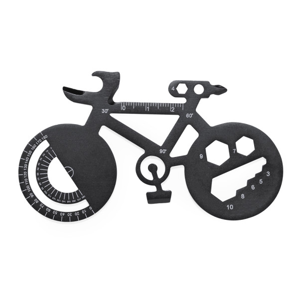 Handliches und nützliches Multifunktionswerkzeug aus Edelstahl in Fahrradform. Mit 16 Funktionen, unter anderem: Schlitz- und Kreuzschlitzschraubendreher, Schraubenschlüssel für Sechskantmuttern in verschiedenen Größen, Lineal, Winkelmesser und Flaschenöffner. Präsentiert in einer recycelten Papiertüte.