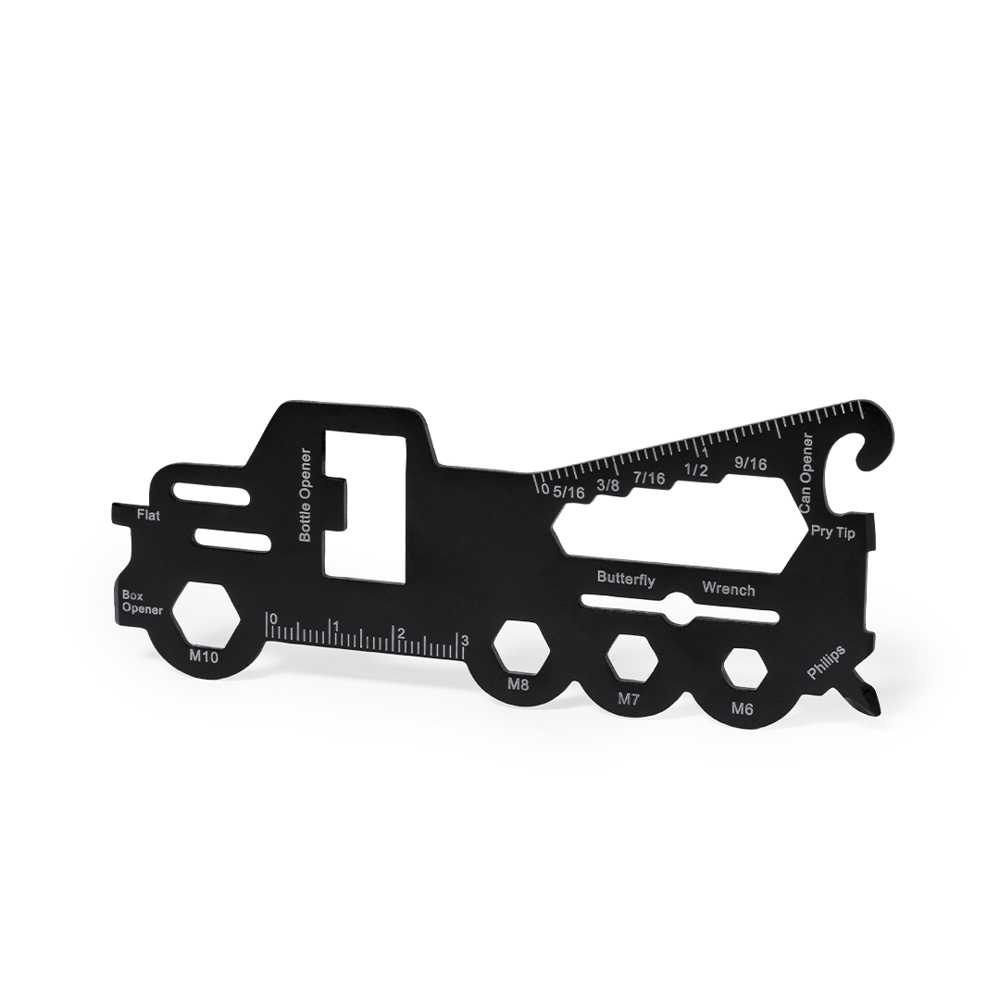 Cooles und praktisches Multitool aus Edelstahl in Form eines Lastwagens. Mit 18 Funktionen, unter anderem: Schlitz- und Kreuzschlitzschraubendreher, Sechskantschlüssel in verschiedenen Größen, Lineal, Dosenöffner und Flaschenöffner. Präsentiert in einer recycelten Papiertüte.