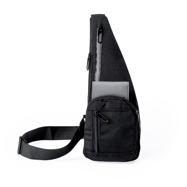 Diese Umhängetasche aus 300D-Polyester bietet mehrere Taschen für eine effektive Organisation. Auf der Vorderseite und an der Seite befinden sich zwei Haupttaschen sowie zwei zusätzliche Taschen auf der Vorder- und Rückseite. Für bessere Sichtbarkeit sorgt ein reflektierender Streifen an der Mitteltasche. Einzeln in einer recycelten Tasche präsentiert.