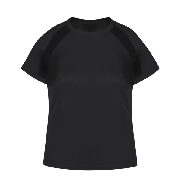 Damen-T-Shirt aus 100% atmungsaktivem Polyester mit 135g/m2. Mit Ranglan-Ärmeln, Rundhalsausschnitt und Front- und Seitenstreifen aus atmungsaktivem, mikroperforiertem Gewebe. Erhältlich in den Größen S, M, L, XL.