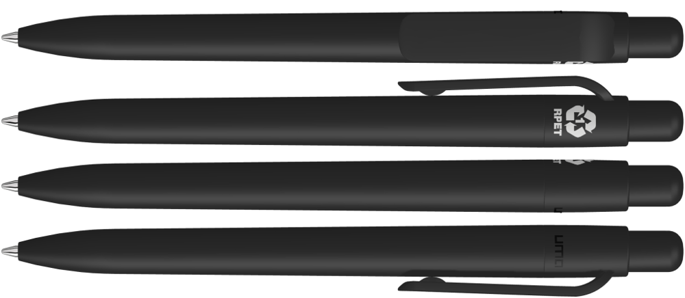 Druckkugelschreiber aus recyceltem PET-Material mit matt gedecktem Gehäuse, Clip, Drücker und Stopfen.