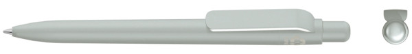 Druckkugelschreiber aus recyceltem PET-Material mit matt gedecktem Gehäuse, Clip, Drücker und Stopfen.