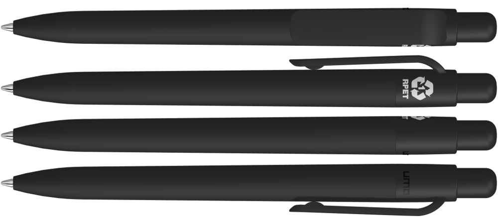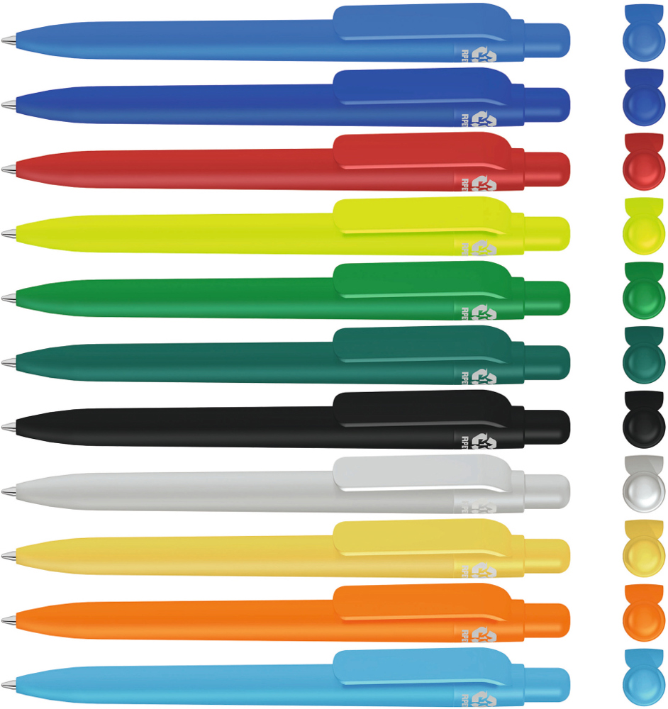 Druckkugelschreiber aus recyceltem PET-Material mit gummiertem Gehäuse und gedeckt mattem Clip, Drücker und Stopfen.