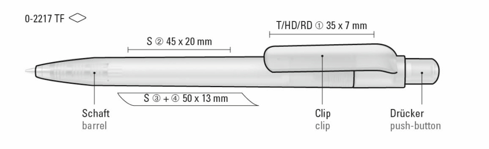 Druckkugelschreiber aus recyceltem PET-Material mit transparent gefrostetem Gehäuse, Clip, Drücker und Stopfen.