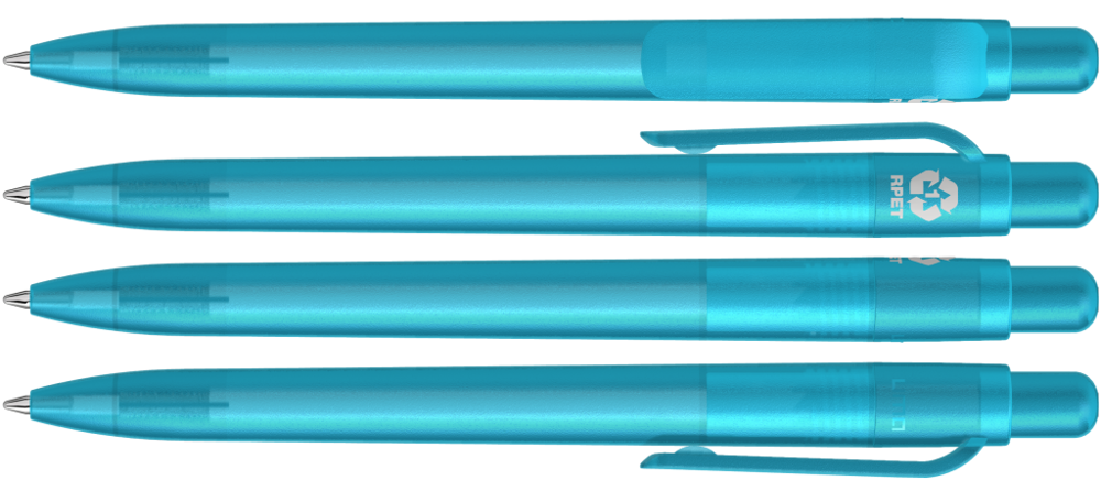 Druckkugelschreiber aus recyceltem PET-Material mit transparent gefrostetem Gehäuse, Clip, Drücker und Stopfen.