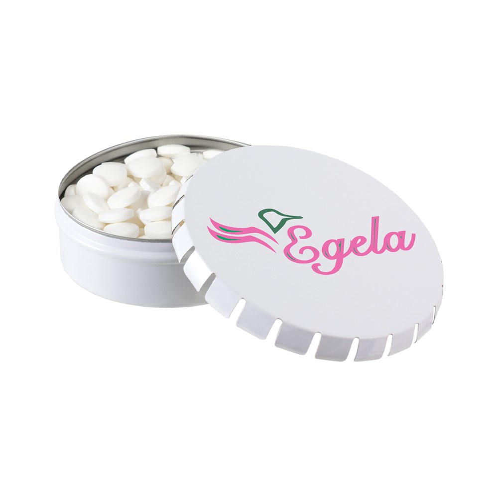 Klick-Klack Dose weiß mit 50 Gramm zuckerfreiem Pfefferminz, 4c-Euroskala, inkl. Zutatenaufkleber und eingeschweißt