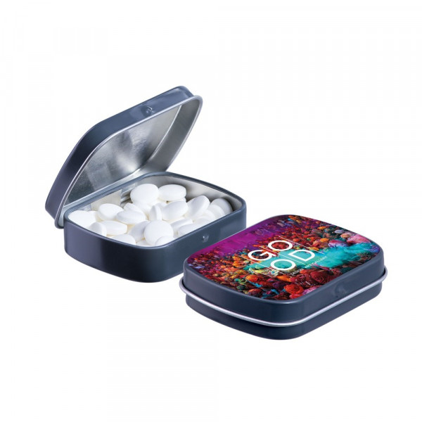 Mini Klappdeckeldose dunkelgrau mit cca. 23 Gramm Pfefferminz, 4c-Euroskala, inkl. Zutatenaufkleber und eingeschweißt