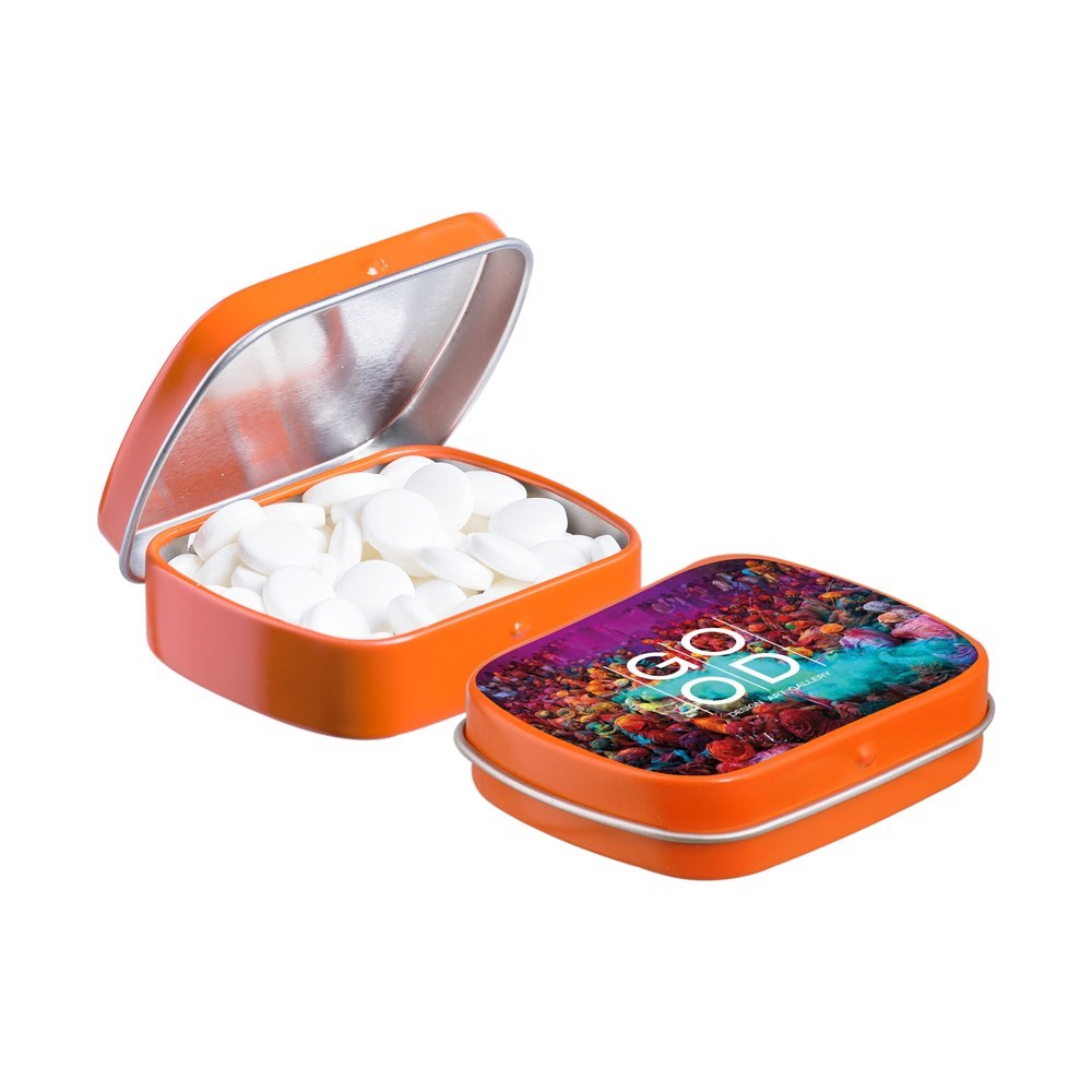 Mini Klappdeckeldose orange mit ca. 23 Gramm Pfefferminz, 4c-Euroskala, inkl. Zutatenaufkleber und eingeschweißt