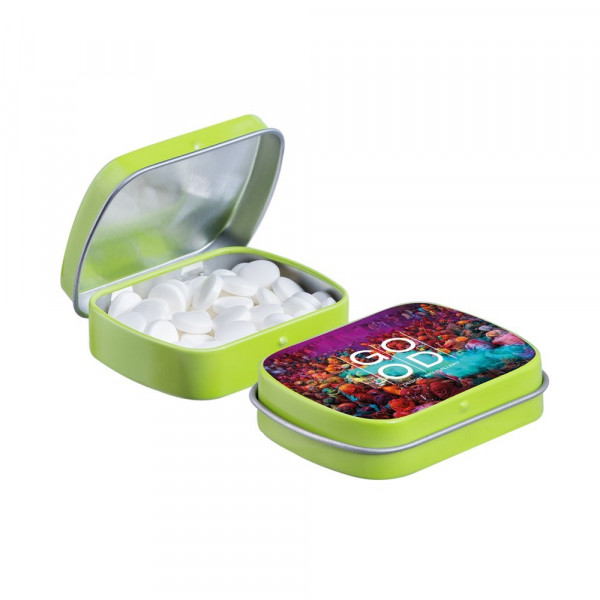 Mini Klappdeckeldose limonengrün mit ca. 23 Gramm Pfefferminz, 4c-Euroskala, inkl. Zutatenaufkleber und eingeschweißt