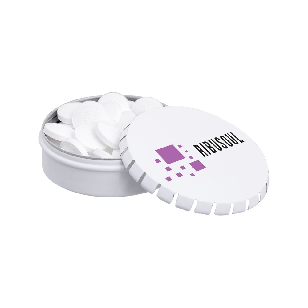 Klick-Klack Dose weiß mit 50 Gramm Compli'mints Pfefferminz, 4c-Euroskala, inkl. Zutatenaufkleber und eingeschweißt
