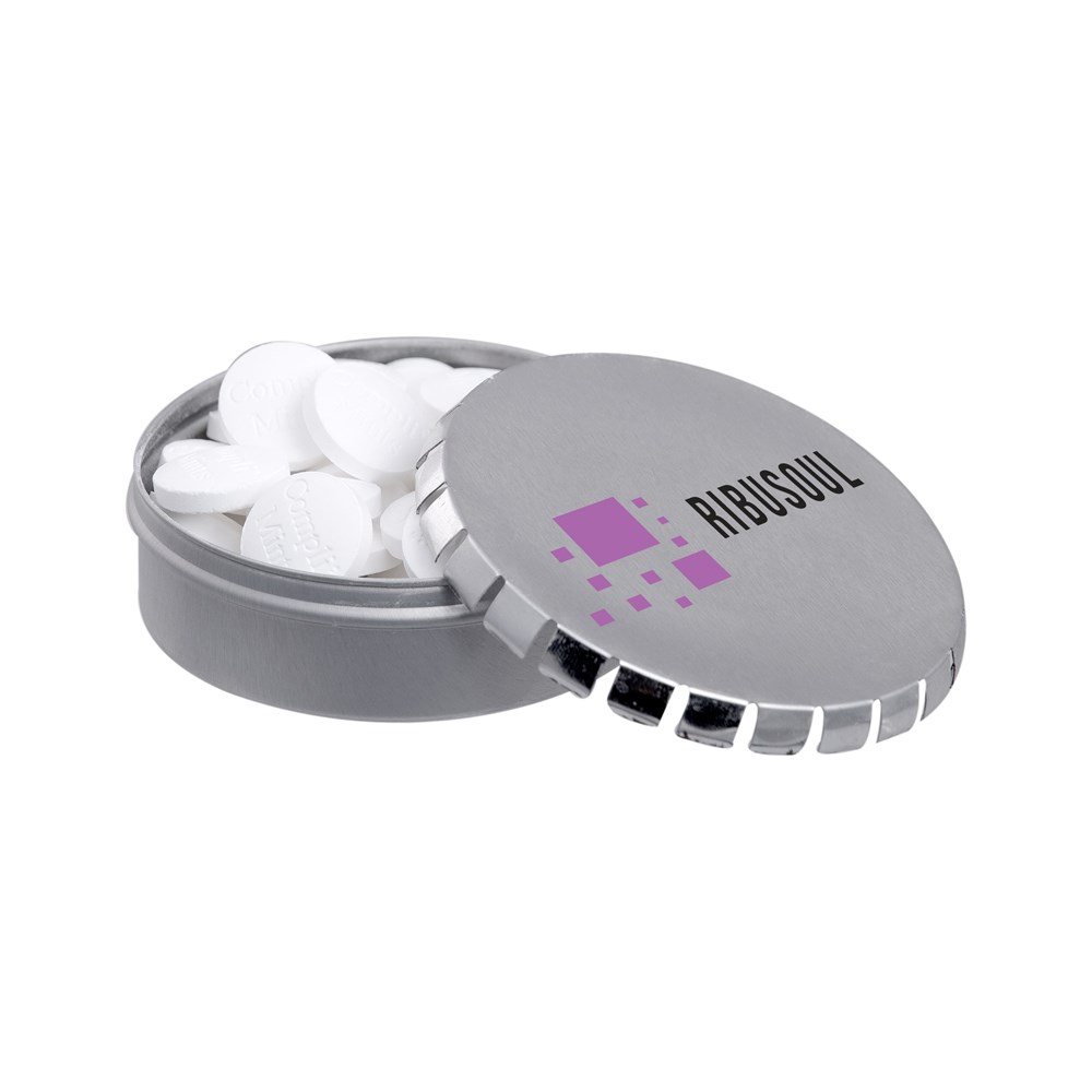 Klick-Klack Dose silber mit 50 Gramm Compli'mints Pfefferminz, 4c-Euroskala, inkl. Zutatenaufkleber und eingeschweißt