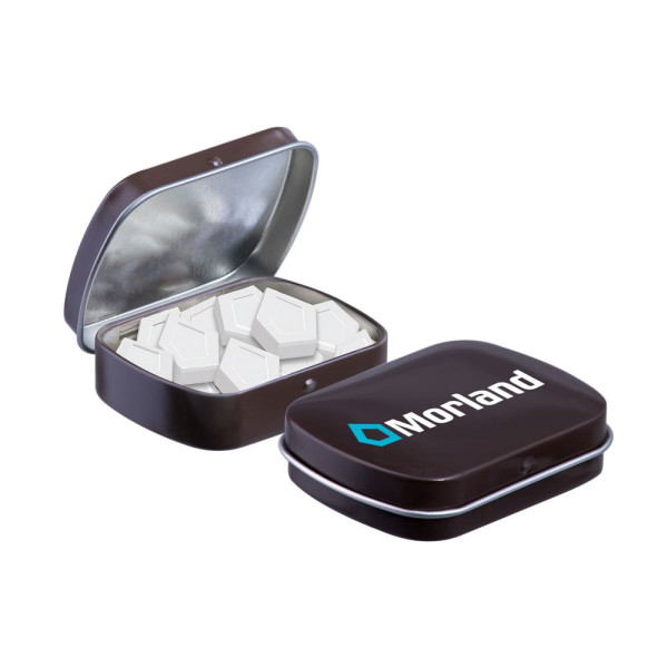 Mini Klappdeckeldose braun mit ca. 23 Gramm Logo Pfefferminz, 4c-Euroskala bedruckt, mit Zutatenaufkleber und eingeschweißt