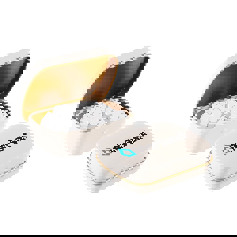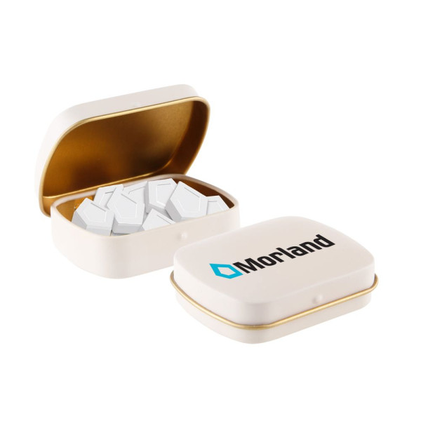 Mini Klappdeckeldose in sand mit goldener Innenseite und ca. 23 Gramm Logo Pfefferminz. Mit Vollfarbdruck, Inhaltsstoffaufkleber und Siegel.