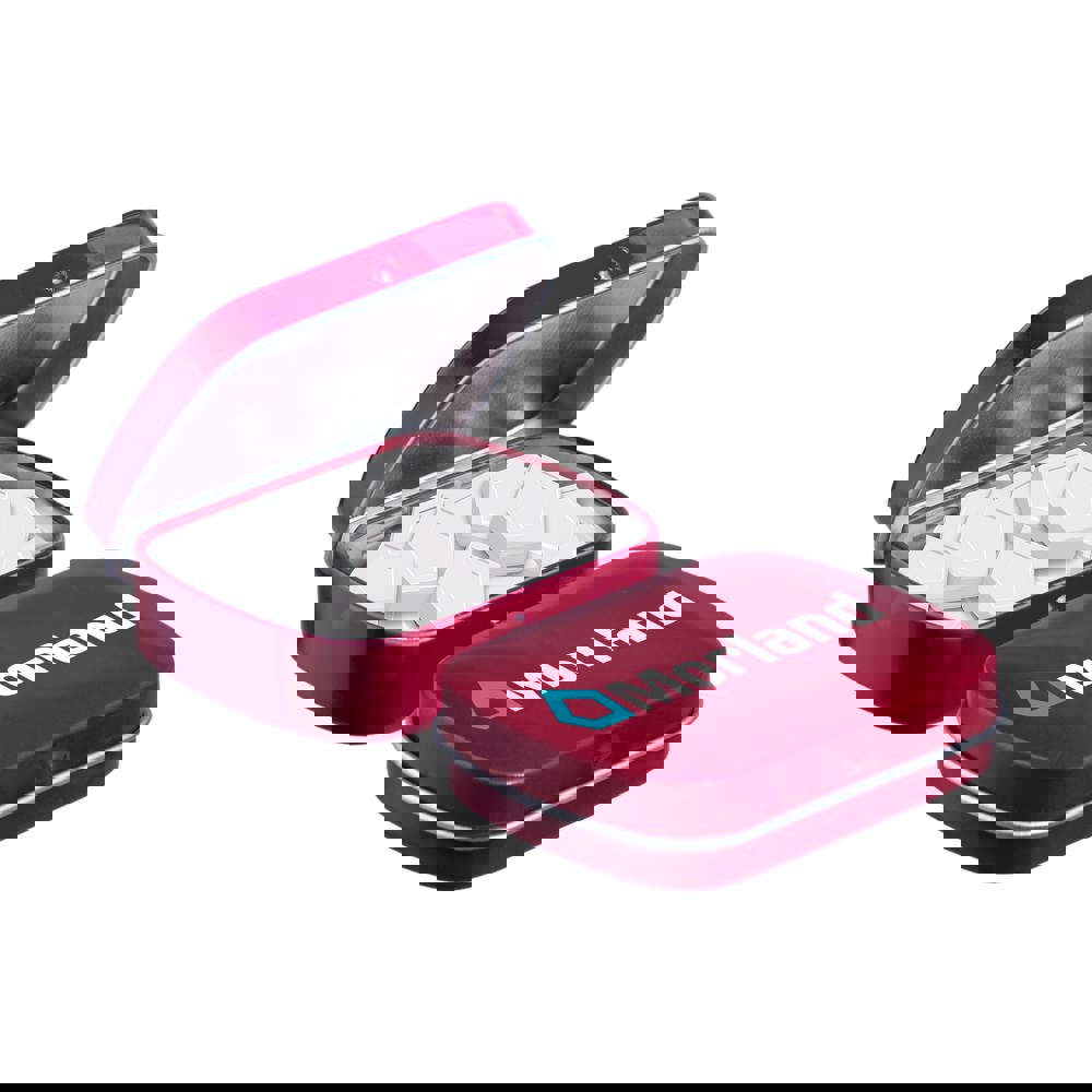 Mini Klappdeckeldose weinrot mit ca. 23 Gramm Logo Pfefferminz, 4c-Euroskala bedruckt, mit Zutatenaufkleber und eingeschweißt