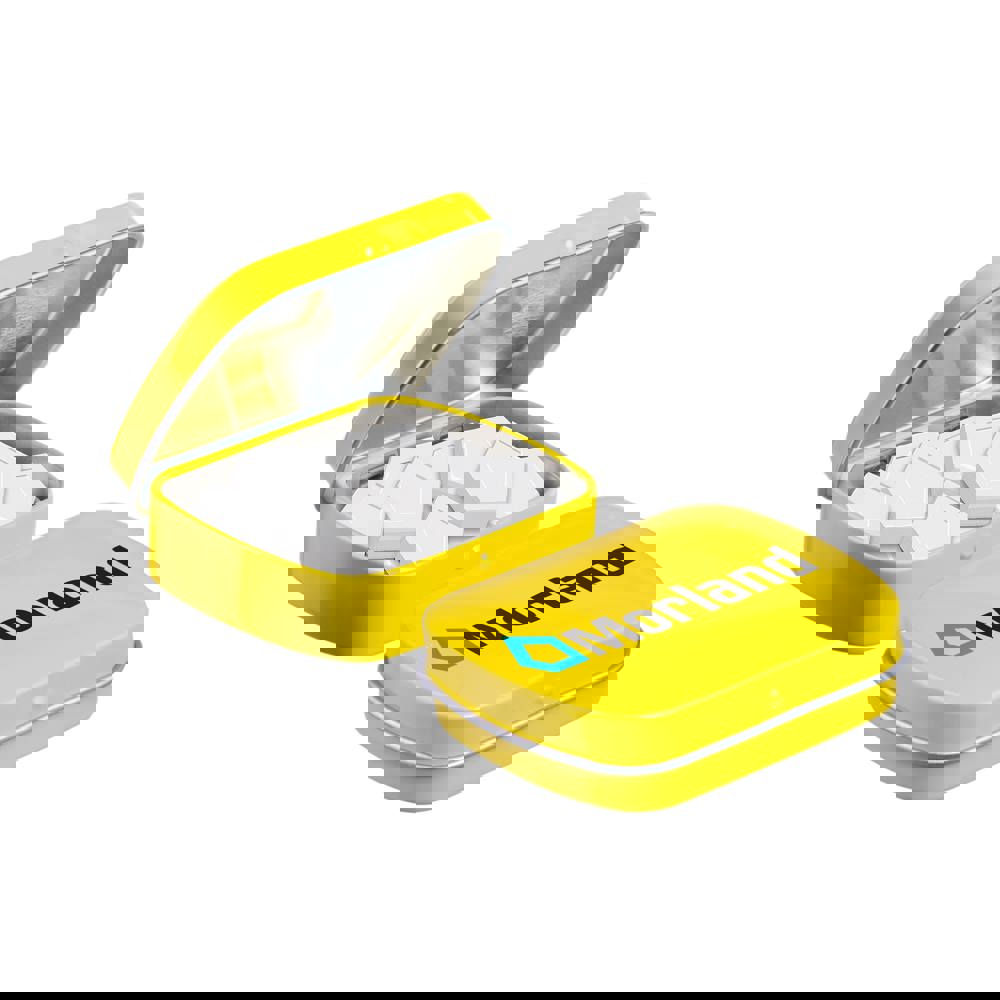 Mini Klappdeckeldose gelb mit ca. 23 Gramm Logo Pfefferminz, 4c-Euroskala bedruckt, mit Zutatenaufkleber und eingeschweißt