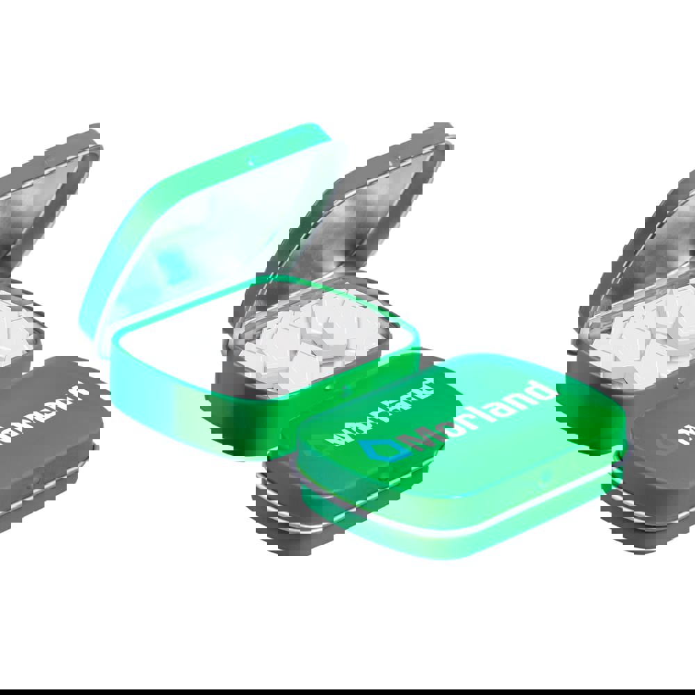 Mini Klappdeckeldose grün mit ca. 23 Gramm Logo Pfefferminz, 4c-Euroskala bedruckt, mit Zutatenaufkleber und eingeschweißt