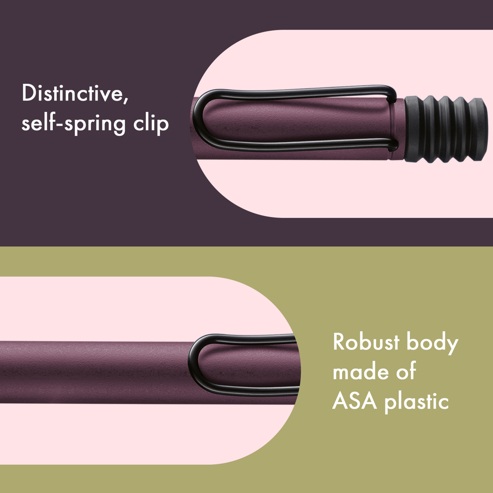 Der LAMY safari ist mehr als die Summe seiner Details: Er ist ästhetisch, robust und individuell. Der markante, selbstfedernde Clip hält das Schreibgerät sicher an Ort und Stelle befestigt. Das Gehäuse aus schlagzähem Kunststoff macht ihn zum robusten Begleiter in jedem Umfeld und die abgeflachte Form verhindert versehentliches Wegrollen. Funktionale Details wie subtil ergonomisch geformte Griffflächen und ein Sichtfenster zur Kontrolle des Tintenstands fügen sich wie selbstverständlich in das Design ein und machen den LAMY safari zum modernen Klassiker. Aus robustem ABS-Kunststoff, griffsympathisch durch markante Griffmulden, mit verchromtem, selbstfederndem Metallclip,