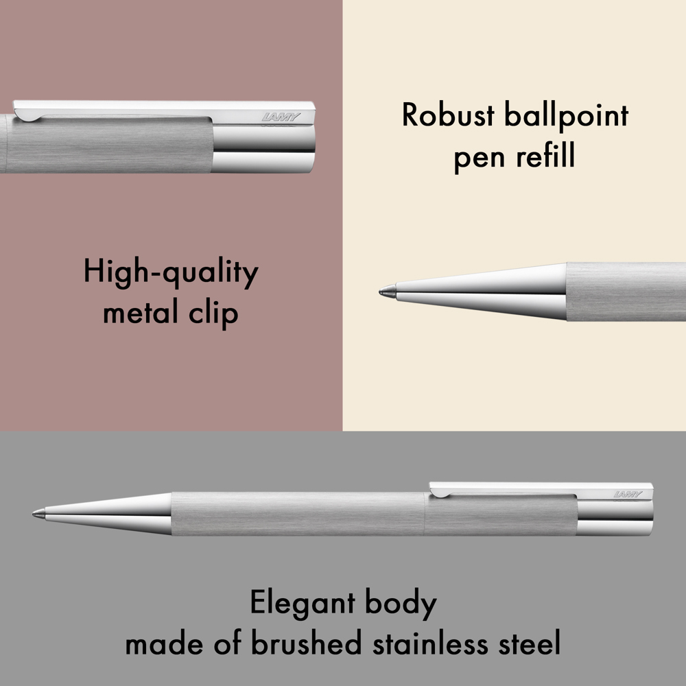 Der LAMY scala vereint puristische Formalität und emotionsgeladene Details. Durch bewusstes Verzichten auf materiellen Überfluss strahlt er eine edle Zurückhaltung aus, hinter der sich hochpräzise technische Detaillösungen verbergen: Die komplexe Mechanik der Schreibgeräte wird in der LAMY Manufaktur in Heidelberg komplett von Hand montiert. Der massive Clip und der Körper aus Ganzmetall verleihen der Serie eine robuste Eleganz, während das Griffstück aus poliertem Metall ein angenehmes Schreibgefühl bietet. Kugelschreiber mit Drehmechanik, zylindrischer Korpus aus rostfreiem Edelstahl, verchromter Edelstahlclip, verchromtes Stiftende