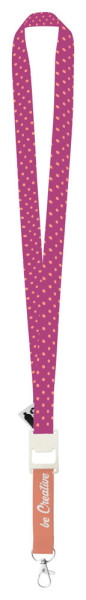 Individuelles Lanyard aus RPET mit Metallkarabiner und Flaschenöffner. Der Preis ist inkl. Sublimationsdruck auf beiden Seiten. Mindestmenge: 100 Stk.
