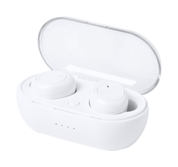 Echte kabellose Stereo-Ohrhörer (TWS) mit Freisprechfunktion im Kunststoff-Ladeetui. Inklusive USB-Ladekabel.