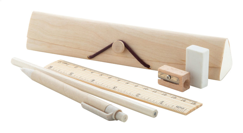 5-teiliges Schreibset aus Holz in einem Holzstiftetui. Inklusive Kugelschreiber aus Recyclingpapier (blauschreibend), Bleistift (HB, ungespitzt), 15 cm Lineal, Anspitzer und Radiergummi.