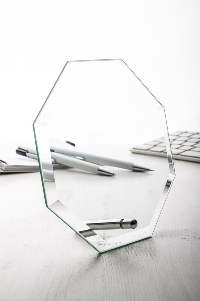 Achteckige Trophäe mit Halter. Einzeln in schwarzer Geschenkbox.