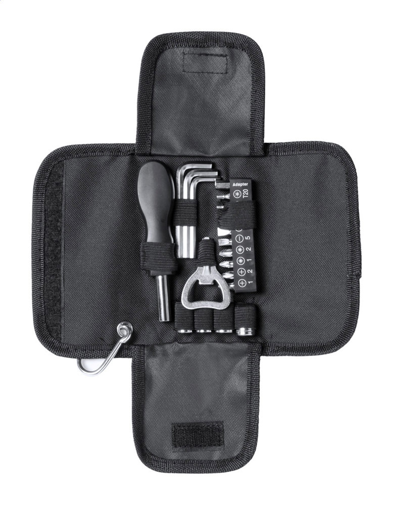 19-teiliges Werkzeugset in Polyester-Etui mit Karabinerhaken.