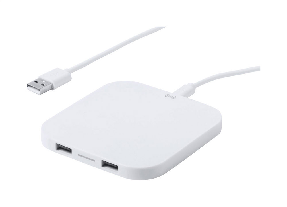 Wireless-Charger (10 W) aus Kunststoff mit 2 USB-Ports. Max. Ausgang 2100 mA. Inkl. USB-Kabel.